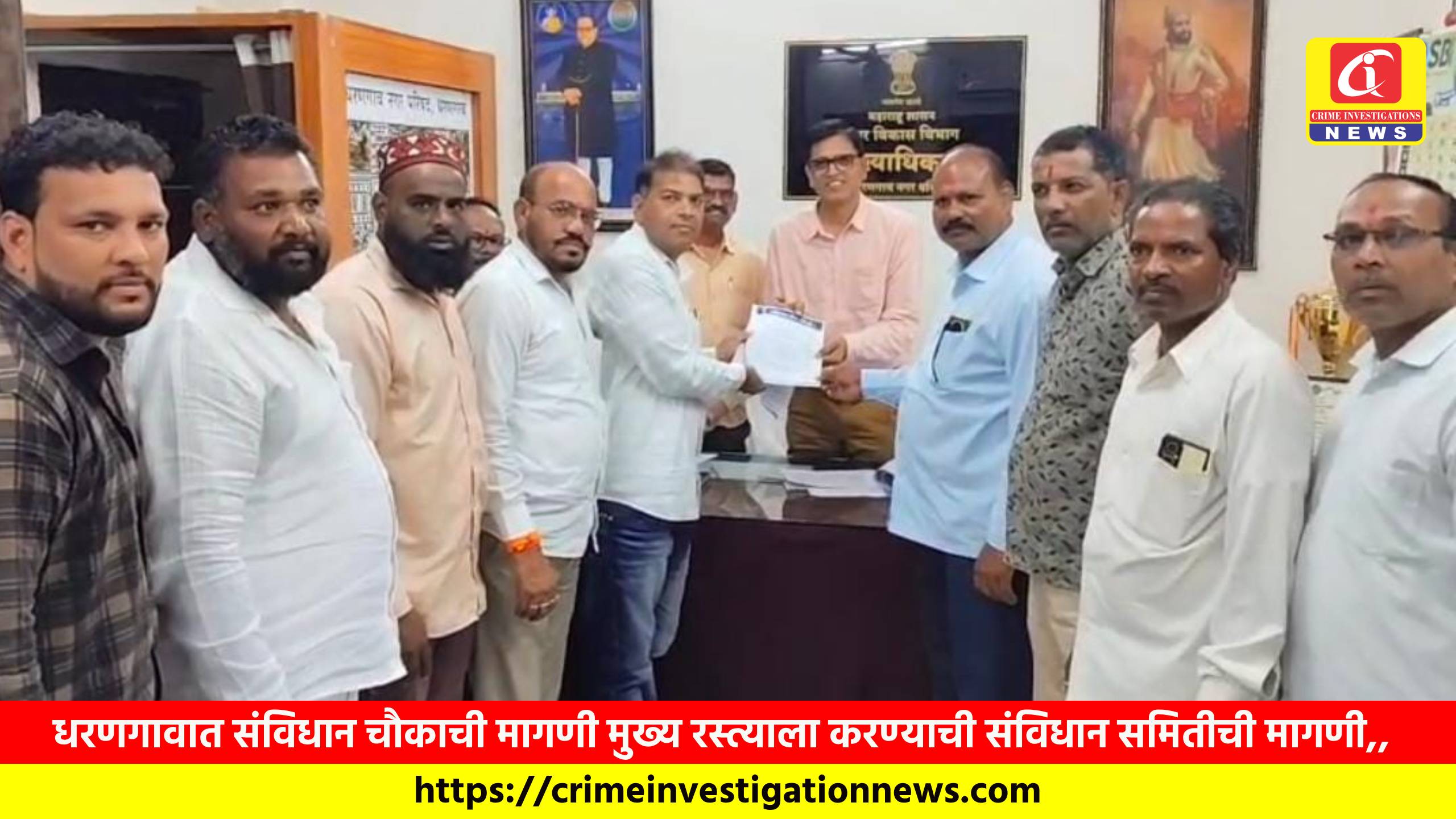 या महान संविधानाचा आदर आणि गौरव करण्यासाठीच धरणगाव शहरात एक ‘संविधान चौक असावा अशी समाजाची तीव्र भावना आहे. हा चौक भावी पिढ्यांसाठी एक प्रेरणास्थान ठरेल आणि त्यांना संविधानाने दिलेल्या अधिकारांची व कर्तव्यांची जाणीव करून देईल. तरी, आमच्या या मागणीचा गांभीर्याने विचार करून, शहराच्या सौंदर्यात भर घालेल आणि सर्वांना सहज उपलब्ध होईल अशा ठिकाणी जागेची निवड करावी, अशी आमची विनंतो आहे. या महत्त्वपूर्ण मागणीला सकारात्मक प्रतिसाद देऊन आपण सहकार्य करावे अशी मागणी करण्यात आली धरणगाव नगरपालिकेचे मुख्याधिकारी रामनिवास झंवर यांना संविधान समितीकडून निवेदन देण्यात आले यावेळेस उपस्थित दिपक वाघमारे , भानुदास विसावे,बापू मोरे ,सुनील चव्हाण, पापाशेट वाघरे, नासिर मोमीन, बाळू जाधव, अजय मैराळे, सुधाकर साळुंखे ,धर्मराज मोरे ,अविनाश बाविस्कर, चेतन वाघरे, सागर भील, शिवा भील ,प्रल्हाद चव्हाण ,अशरफ भाई मोमीन, शहीद भाई मोमीन आदी उपस्थित होते.