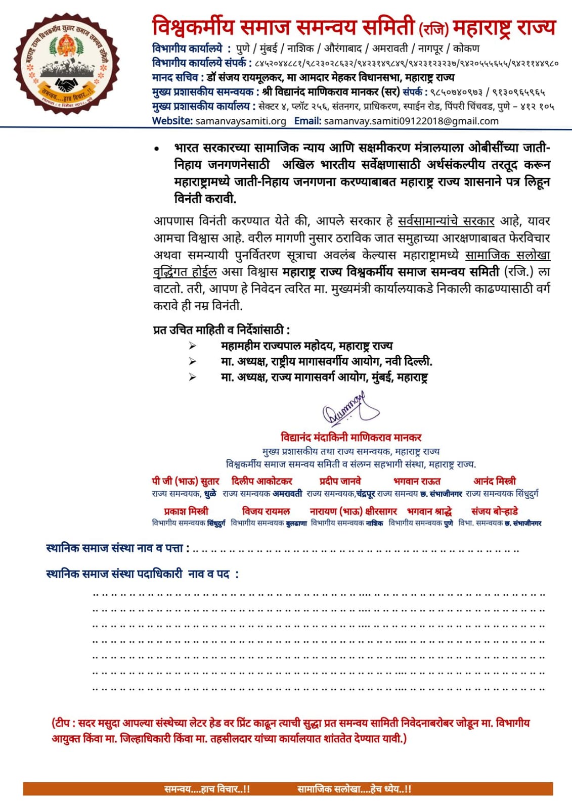 आपणास विनंती करण्यात येते की, आपले सरकार हे सर्वसामान्यांचे सरकार आहे, यावर आमचा विश्वास आहे. वरील मागणी नुसार ठराविक जात समुहाच्या आरक्षणाबाबत फेरविचार अथवा समन्यायी पुनर्वितरण सूत्राचा अवलंब केल्यास महाराष्ट्रामध्ये सामाजिक सलोखा वृद्धिंगत होईल असा विश्वास महाराष्ट्र राज्य विश्वकर्मीय समाज समन्वय समिती (रजि.) ला वाटतो. तरी, आपण हे निवेदन त्वरित मा. मुख्यमंत्री कार्यालयाकडे निकाली काढण्यासाठी वर्ग करावे ही नम्र विनंती.