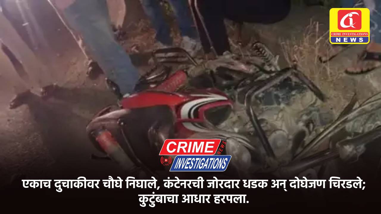 सुभाष अमृत वड (वय २५) आणि स्वप्नील परब (वय २०) अशी अपघातातील मृत तरुणांची नावे आहेत. सुभाष वड, स्वप्निल परब आणि त्यांचे दोन साथीदार असे चौघेजण एकाच दुचाकीवर स्वार होऊन मुंबई-अहमदाबाद राष्ट्रीय महामार्गावरून ढेकाळे येथून बोईसर नजीक असलेल्या मान परिसरात जाण्यासाठी निघाले होते. राष्ट्रीय महामार्गावर हालोली गावाच्या हद्दीत असलेल्या भिवंडी ढाब्यासमोर त्यांच्या दुचाकीला अज्ञात कंटेनरले जोरदार धडक दिली आणि भीषण अपघात घडला. मंगळवारी रात्री एक वाजताच्या सुमारास हा अपघात घडला आहे.दुचाकीला कंटेनरच्या बाजूची धडक लागल्याने दुचाकीसह दुचाकीस्वार सर्वजण रस्त्यावर खाली पडले. यावेळी सुभाष आणि स्वप्नील हे दोघेही कंटेनरच्या टायर खाली चिरडले गेले. यामुळे त्यांचा जागीच मृत्यू झाला आहे. तर भावेश गणेश दांडूळे (वय २८) राज सञु मिश्रा (वय १९) हे दोघेजण गंभीररित्या जखमी झाले आहेत.घटनेची माहिती मिळताच मनोर पोलीस व वाहतूक पोलीस घटनास्थळी दाखल झाले आहेत. अपघातातील जखमींना तातडीने उपचारासाठी मनोर ग्रामीण रुग्णालयात दाखल करण्यात आले. पोलिसांनी घटनास्थळाचा पंचनामा करून मृतदेह ताब्यात घेत शवविच्छेदनासाठी पाठवले. या अपघातप्रकरणी अज्ञात कंटेनर चालकाविरोधात मनोर पोलीस ठाण्यात गुन्हा दाखल करण्यात आला आहे.